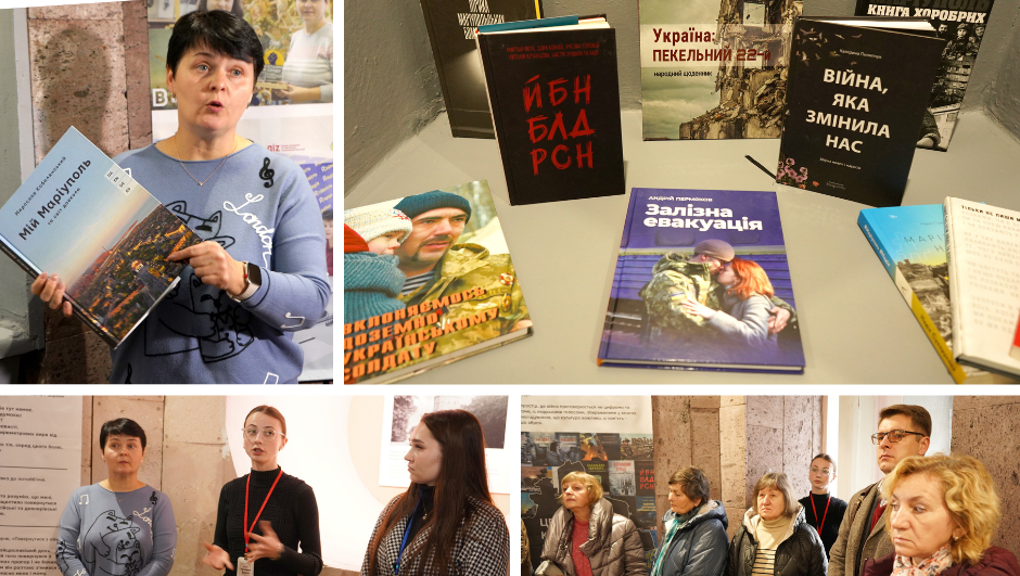 Книги з бібліотек Маріуполя були знищені окупантами. Але фонд вдається нині поповнювати завдяки небайдужим маріупольцям вже у Дніпрі, де частково відновила роботу центральна бібліотека ім. В. Короленка. Видання про російсько-українську війну, тепер стали основою виставки «Написано війною».