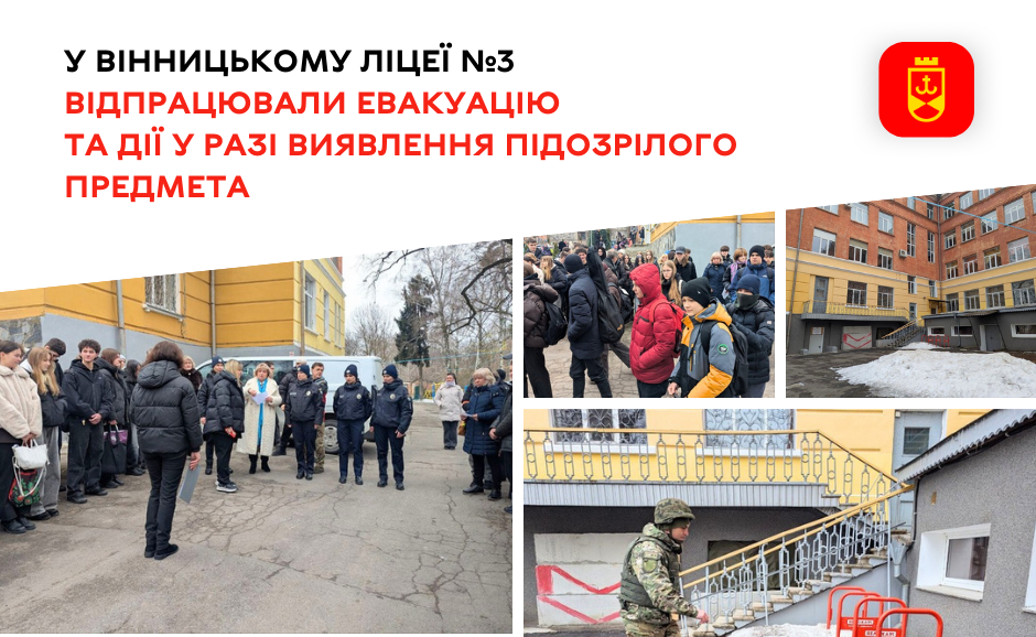 Під час занять у ліцеї №3 Вінниці провели навчальну евакуацію й відпрацювали порядок реагування на підозрілий предмет у межах шкільної території.