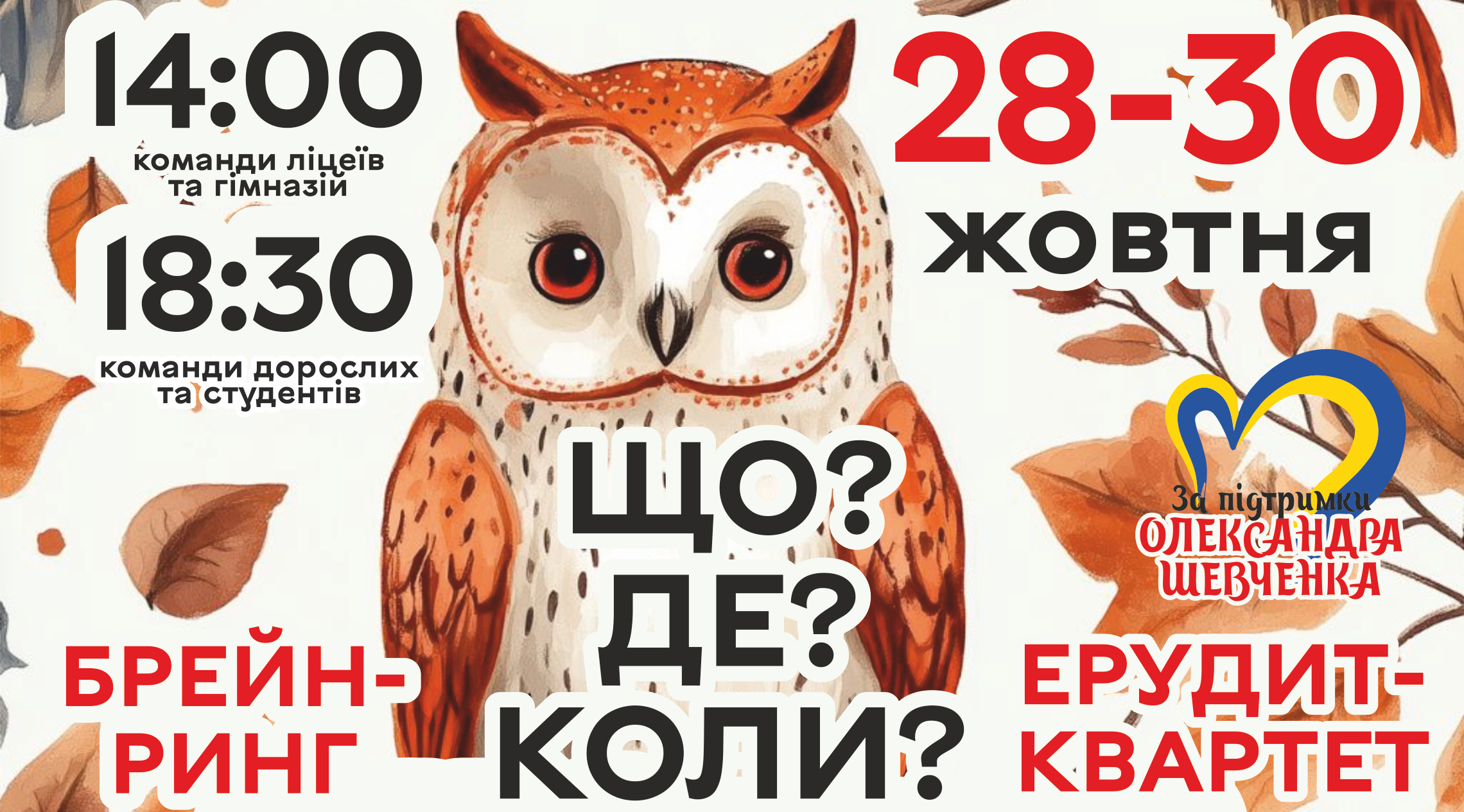 - 28 жовтня, вівторок, 18:30 – «Що? Де? Коли?» студентські та старші команди (попередня реєстрація)