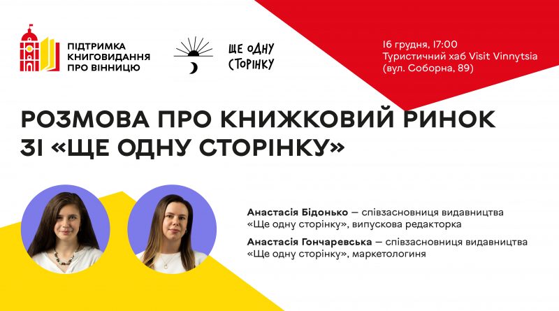 16 грудня о 17:00 у туристичному хабі Visit Vinnytsia (вул. Соборна, 89) відбудеться зустріч, присвячена темі розвитку книжкового ринку. Гостями події стануть випускова редакторка Анастасія Бідонько та маркетологиня Анастасія Гончаревська, які відкриють «закулісся» роботи видавництва та поділяться досвідом у сфері промоції книг.